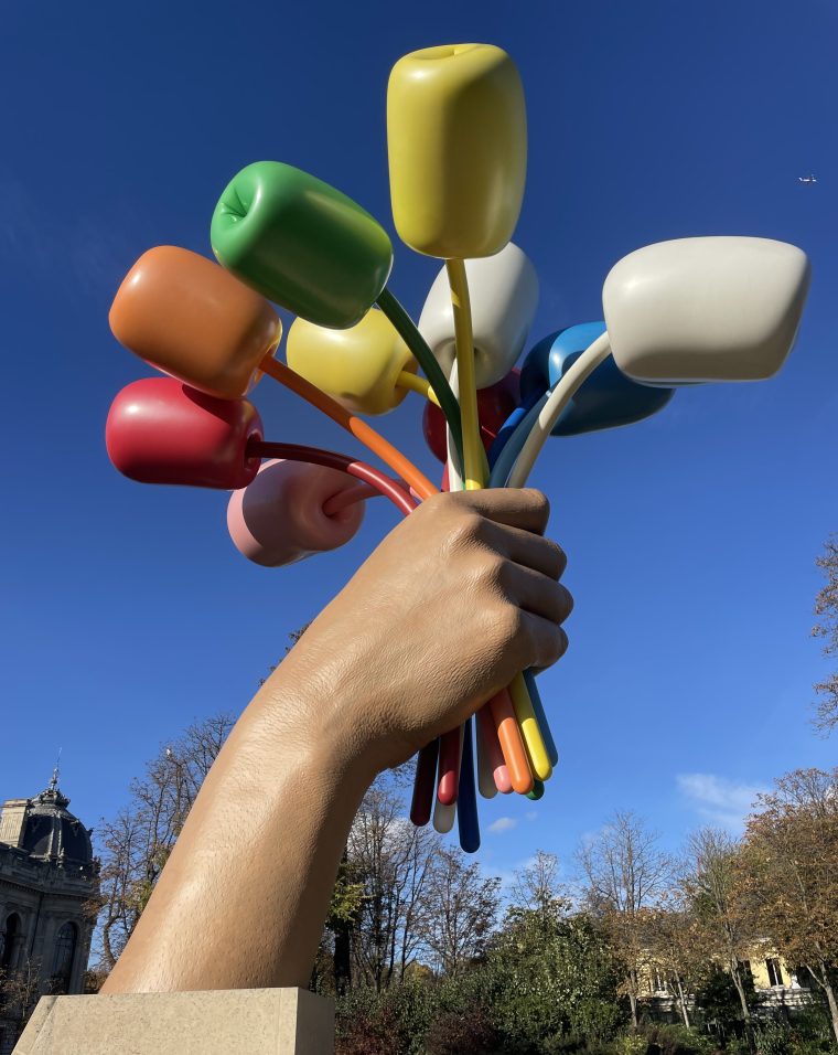 Veletrh sice skončil, ale pokud vás zajímá současné umění, můžete si za budouvou Petit Palais prohlédnou sochu Bouquet of Tulips od Jeffa Koonse.